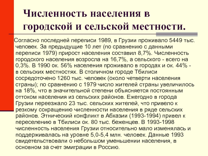 предыдущие 10 лет (по сравнению с данными переписи 1979) прирост населения составил 8,7%. Численность городского населения возросла на 16,7%, а сельского - всего на 0,3%. В 1990 ок. 56% населения проживало в городах и ок. 44% - в сельских местностях. В столичном городе Тбилиси сосредоточено 1260 тыс. человек (около четверти населения страны); по сравнению с 1979 число жителей страны увеличилось на 18%, что в значительной степени объясняется постоянным оттоком населения из сельских районов. Ежегодно в города Грузии переезжало 23 тыс. сельских жителей, что привело к резкому сокращению численности населения в ряде сельских районов. Этнический конфликт в Абхазии (1993-1994) привел к переселению в Тбилиси ок. 80 тыс. беженцев. В 1993-1998 численность населения Грузии относительно мало изменялась и поддерживалась на уровне 5,0-5,4 млн. человек. Данные 1993 свидетельствовали о небольшом уменьшении населения, в основном за счет эмиграции в Россию.