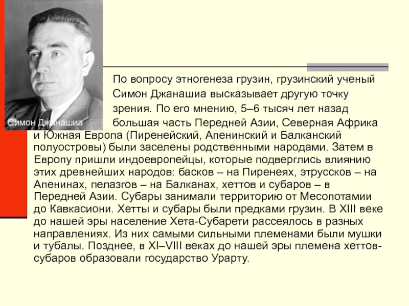 большая часть Передней Азии, Северная Африка и Южная Европа (Пиренейский, Апенинский и Балканский полуостровы) были заселены родственными народами. Затем в Европу пришли индоевропейцы, которые подверглись влиянию этих древнейших народов: басков – на Пиренеях, этруссков – на Апенинах, пелазгов – на Балканах, хеттов и субаров – в Передней Азии. Субары занимали территорию от Месопотамии до Кавкасиони. Хетты и субары были предками грузин. В XIII веке до нашей эры население Хета-Субарети рассеялось в разных направлениях. Из них самыми сильными племенами были мушки и тубалы. Позднее, в XI–VIII веках до нашей эры племена хеттов-субаров образовали государство Урарту.
