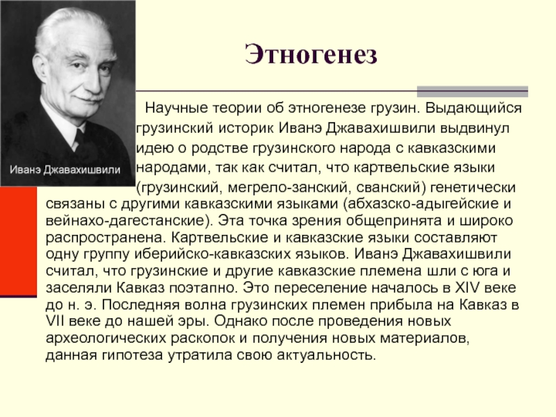 (грузинский, мегрело-занский, сванский) генетически связаны с другими кавказскими языками (абхазско-адыгейские и вейнахо-дагестанские). Эта точка зрения общепринята и широко распространена. Картвельские и кавказские языки составляют одну группу иберийско-кавказских языков. Иванэ Джавахишвили считал, что грузинские и другие кавказские племена шли с юга и заселяли Кавказ поэтапно. Это переселение началось в XIV веке до н. э. Последняя волна грузинских племен прибыла на Кавказ в VII веке до нашей эры. Однако после проведения новых археологических раскопок и получения новых материалов, данная гипотеза утратила свою актуальность.