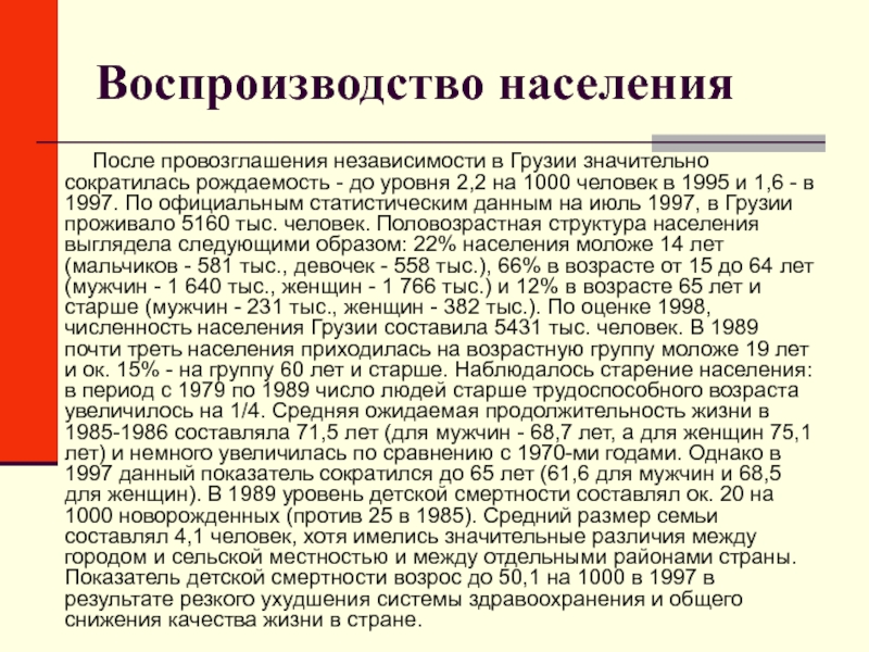 1000 человек в 1995 и 1,6 - в 1997. По официальным статистическим данным на июль 1997, в Грузии проживало 5160 тыс. человек. Половозрастная структура населения выглядела следующими образом: 22% населения моложе 14 лет (мальчиков - 581 тыс., девочек - 558 тыс.), 66% в возрасте от 15 до 64 лет (мужчин - 1 640 тыс., женщин - 1 766 тыс.) и 12% в возрасте 65 лет и старше (мужчин - 231 тыс., женщин - 382 тыс.). По оценке 1998, численность населения Грузии составила 5431 тыс. человек. В 1989 почти треть населения приходилась на возрастную группу моложе 19 лет и ок. 15% - на группу 60 лет и старше. Наблюдалось старение населения: в период с 1979 по 1989 число людей старше трудоспособного возраста увеличилось на 1/4. Средняя ожидаемая продолжительность жизни в 1985-1986 составляла 71,5 лет (для мужчин - 68,7 лет, а для женщин 75,1 лет) и немного увеличилась по сравнению с 1970-ми годами. Однако в 1997 данный показатель сократился до 65 лет (61,6 для мужчин и 68,5 для женщин). В 1989 уровень детской смертности составлял ок. 20 на 1000 новорожденных (против 25 в 1985). Средний размер семьи составлял 4,1 человек, хотя имелись значительные различия между городом и сельской местностью и между отдельными районами страны. Показатель детской смертности возрос до 50,1 на 1000 в 1997 в результате резкого ухудшения системы здравоохранения и общего снижения качества жизни в стране.
