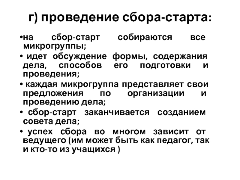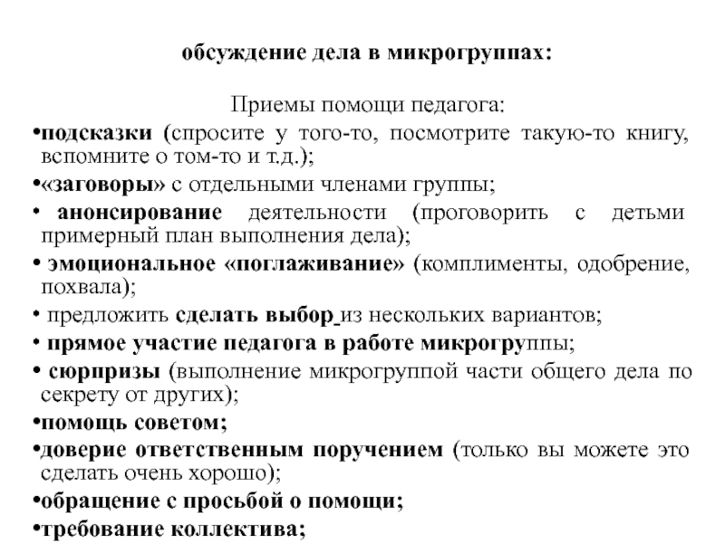 - обсуждается целесообразность предстоящего дела для участников микрогруппы, способы подготовки и проведения дела, роли в этом микрогруппы;