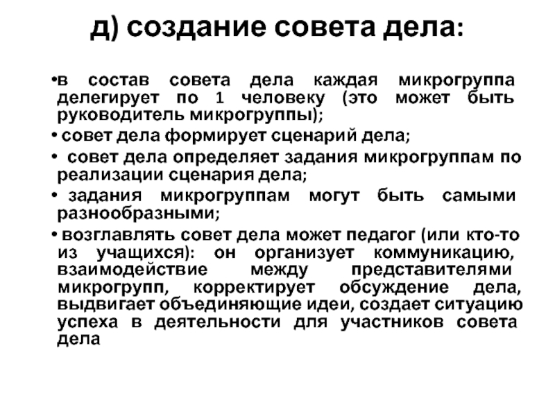 возглавлять совет дела может педагог (или кто-то из учащихся): он организует коммуникацию, взаимодействие между представителями микрогрупп, корректирует обсуждение дела, выдвигает объединяющие идеи, создает ситуацию успеха в деятельности для участников совета дела