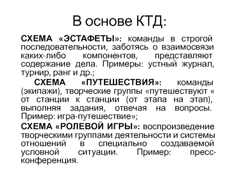 СХЕМА «РОЛЕВОЙ ИГРЫ»: воспроизведение творческими группами деятельности и системы отношений в специально создаваемой условной ситуации. Пример: пресс-конференция.