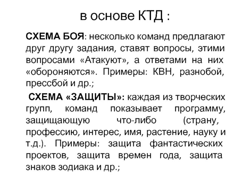 СХЕМА «ЗАЩИТЫ»: каждая из творческих групп, команд показывает программу, защищающую что-либо (страну, профессию, интерес, имя, растение, науку и т.д.). Примеры: защита фантастических проектов, защита времен года, защита знаков зодиака и др.;