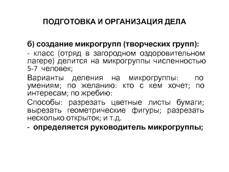 в загородном оздоровительном лагере) делится на микрогруппы численностью 5-7 человек;
