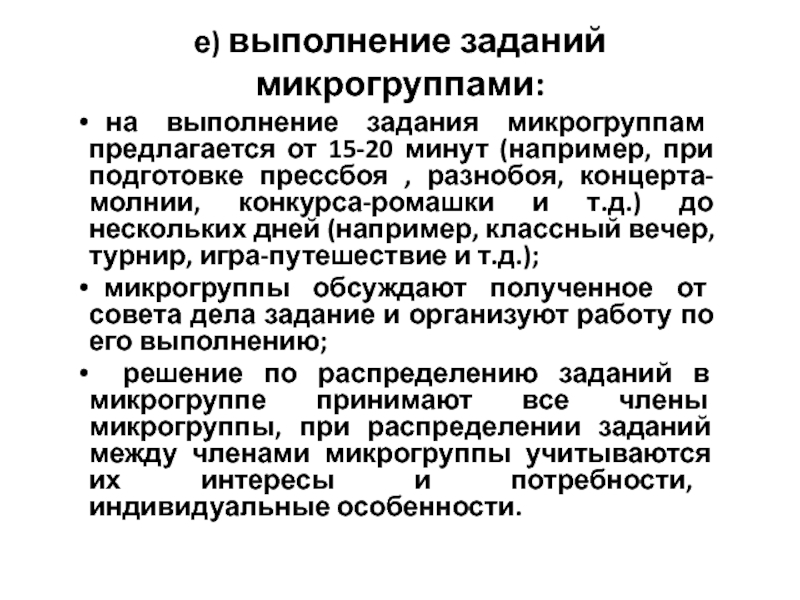 решение по распределению заданий в микрогруппе принимают все члены микрогруппы, при распределении заданий между членами микрогруппы учитываются их интересы и потребности, индивидуальные особенности.