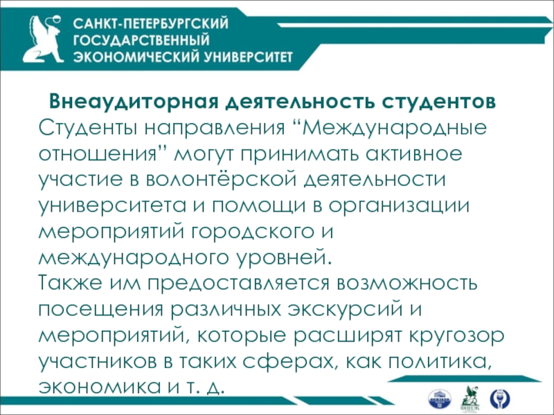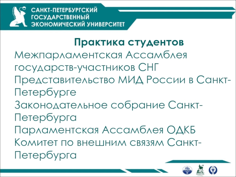 и др. субъектов СЗФО, Торгово-промышленной палаты Санкт-Петербурга, производственные и туристические фирмы, научно-исследовательские и проектные институты и др.) готовы предоставить места для прохождения производственной практики студентов и их дальнейшего трудоустройства.