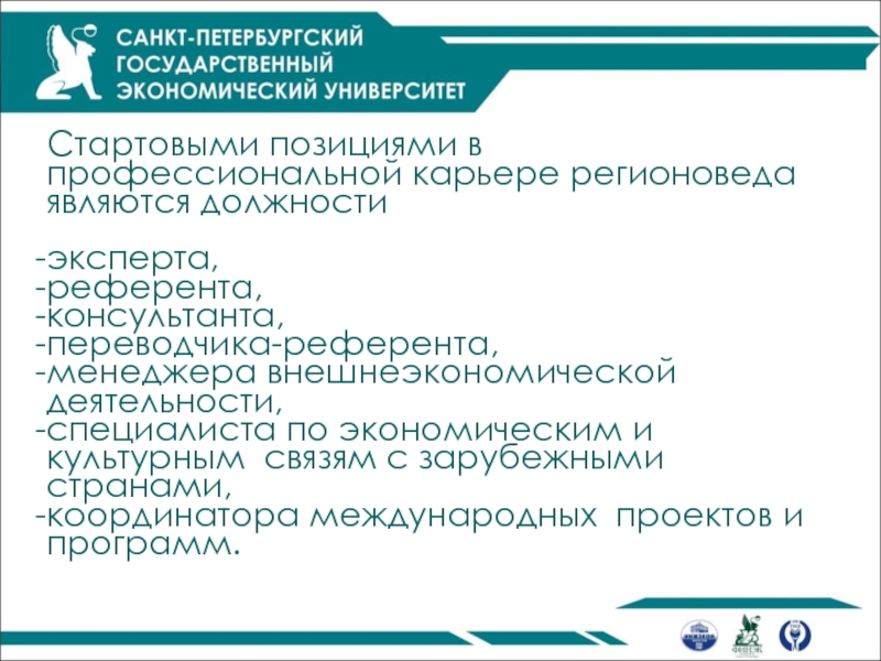 Слайд 10Стартовыми позициями в профессиональной карьере регионоведа являются должности
