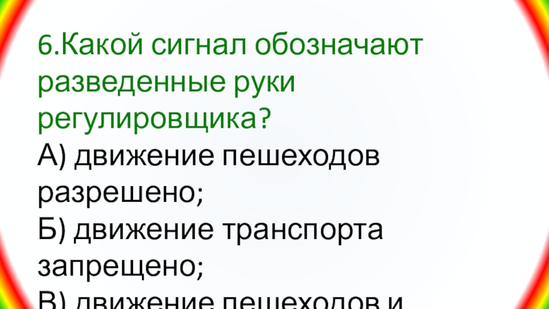 Слайд 336.Какой сигнал обозначают разведенные руки регулировщика?