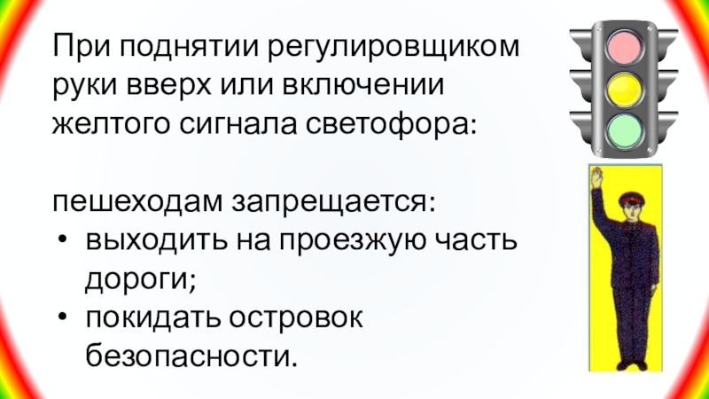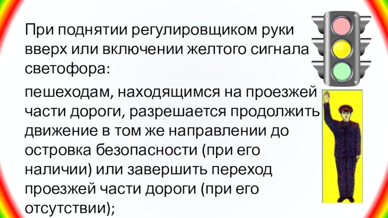 Слайд 26При поднятии регулировщиком руки вверх или включении желтого сигнала светофора: