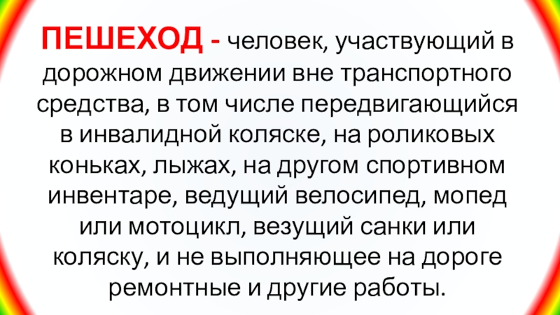 Слайд 5ПЕШЕХОД - человек, участвующий в дорожном движении вне транспортного средства,