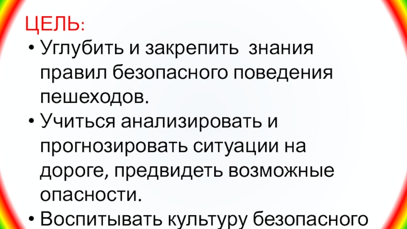 Углубить и закрепить знания правил безопасного поведения пешеходов.