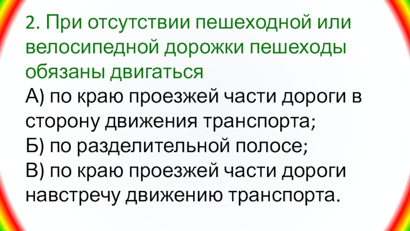 Слайд 292. При отсутствии пешеходной или велосипедной дорожки пешеходы обязаны двигаться