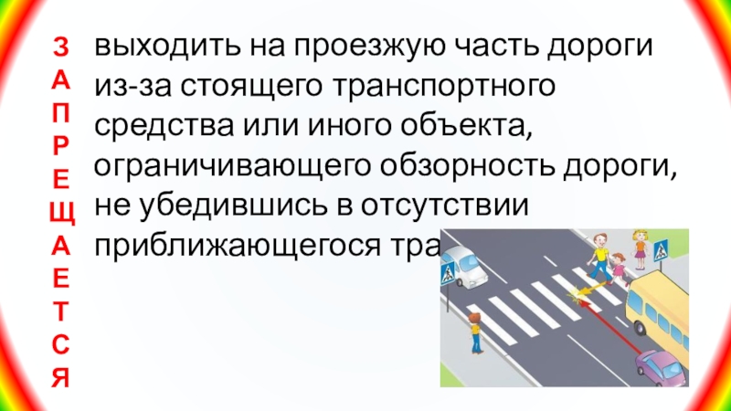 Слайд 19выходить на проезжую часть дороги из-за стоящего транспортного средства или