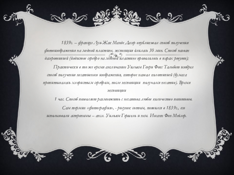 Слайд 8 1839г. – француз Луи-Жак Манде Дагер опубликовал способ получения