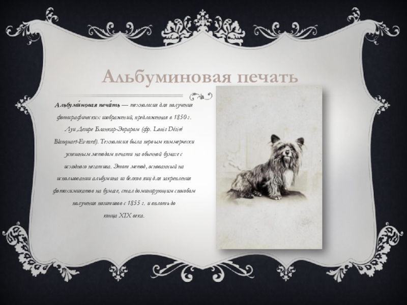 Слайд 13Альбуми́новая печа́ть — технология для получения фотографических изображений, предложенная в 1850 г. Луи
