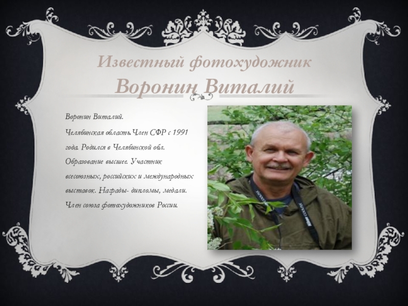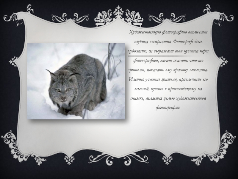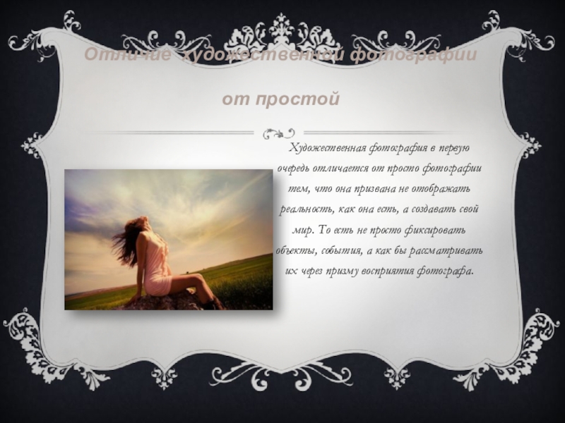 Слайд 5Художественную фотографию отличает глубина восприятия. Фотограф здесь художник, он выражает