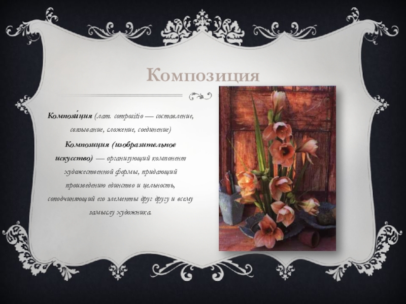 Слайд 18Компози́ция (лат. compositio — составление, связывание, сложение, соединение)
