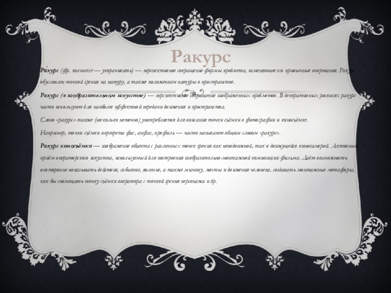Ра́курс (фр. raccourcir — укорачивать) — перспективное сокращение формы предмета, изменяющее его привычные