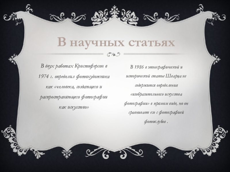 В двух работах Кристоферсон в 1974 г. определил фотохудожника как «человека, создающего и распространяющего фотографии как искусство»