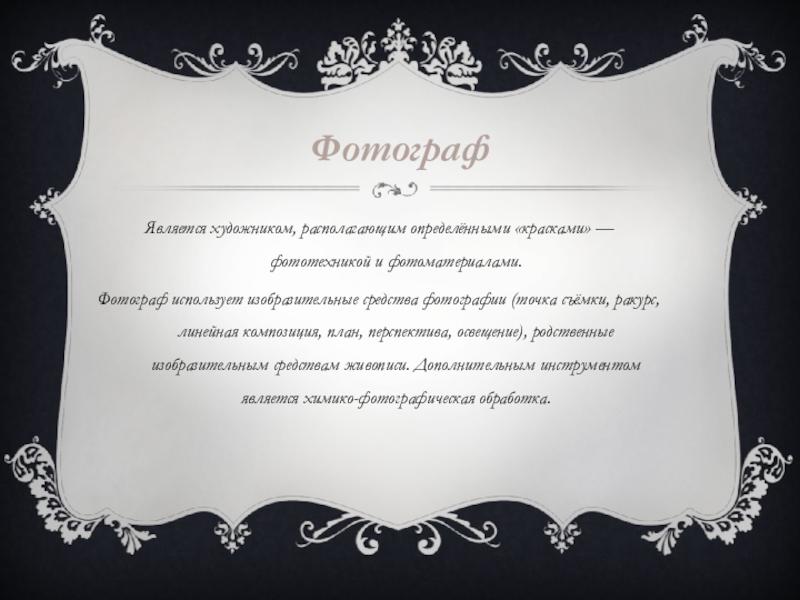 Слайд 14Является художником, располагающим определёнными «красками» — фототехникой и фотоматериалами.