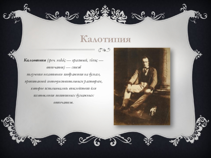 Слайд 11Калотипия (греч. καλός — красивый, τύπος — отпечаток) — способ получения негативного изображения на бумаге, пропитанной светочувствительным раствором,