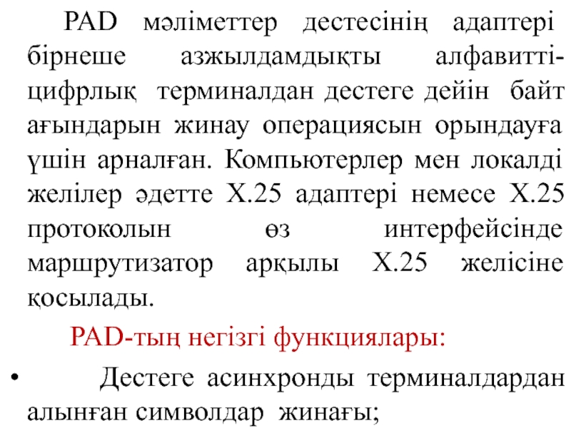 - PAD құрылғысы – мәліметтердің дестелі адаптері (packet assembler/ disassembler) X.25 желісінің мамандандырылған құрылғысы болып табылады.