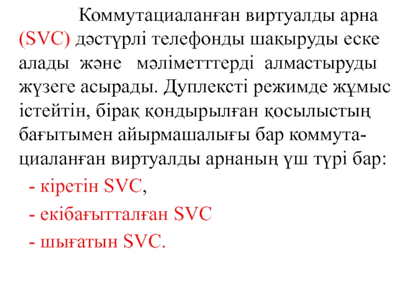 мәліметттерді алмастыруды жүзеге асырады. Дуплексті режимде жұмыс істейтін, бірақ қондырылған қосылыстың бағытымен айырмашалығы бар коммута-циаланған виртуалды арнаның үш түрі бар: