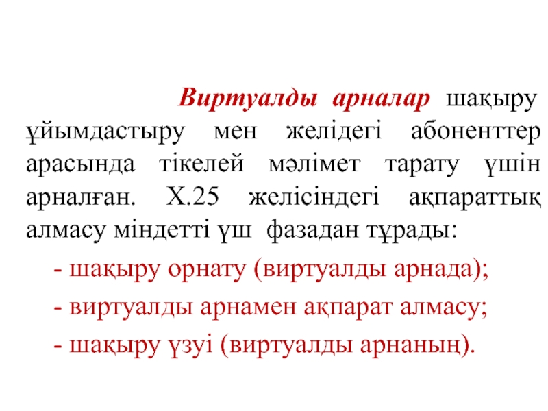 тікелей мәлімет тарату үшін арналған. X.25 желісіндегі ақпараттық алмасу міндетті үш фазадан тұрады: