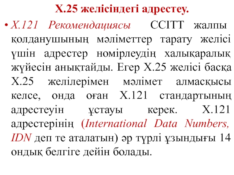 үшін адрестер номірлеудің халықаралық жүйесін анықтайды. Егер Х.25 желісі басқа Х.25 желілерімен мәлімет алмасқысы келсе, онда оған Х.121 стандартының адрестеуін ұстауы керек. Х.121 адрестерінің (International Data Numbers, IDN деп те аталатын) әр түрлі ұзындығы 14 ондық белгіге дейін болады.