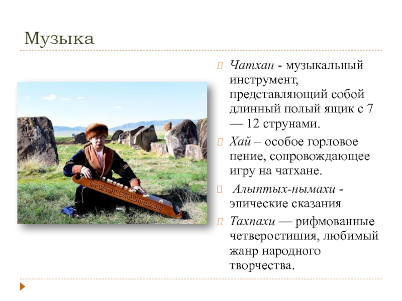 МузыкаЧатхан - музыкальный инструмент, представляющий собой длинный полый ящик с 7 — 12 струнами. Хай – особое