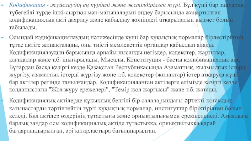 Слайд 11Кодификация - жүйелеудің ең күрделі және жетілдірілген түрі. Бұл күші