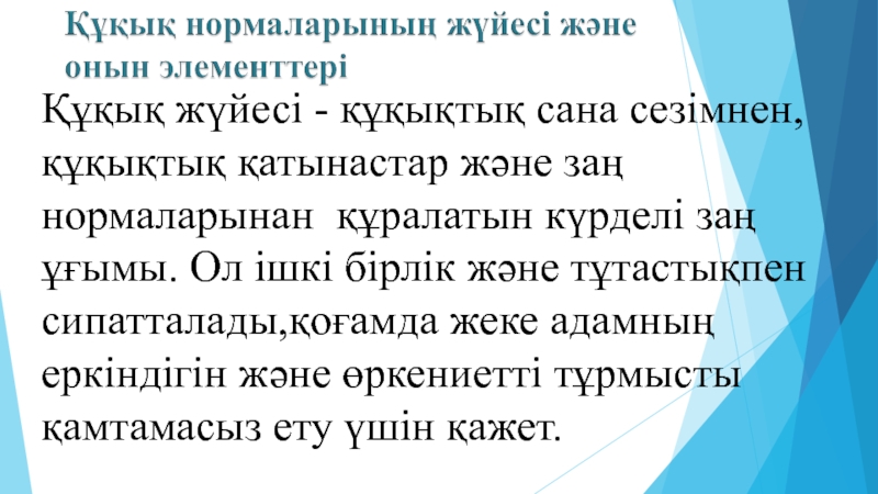 Слайд 3Құқық жүйесі - құқықтық сана сезімнен, құқықтық қатынастар және заң