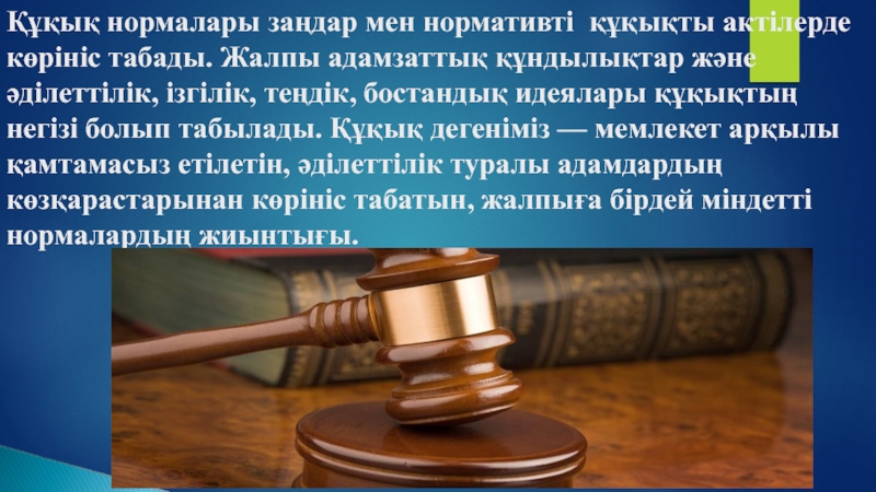 Слайд 2Құқық нормалары заңдар мен нормативті құқықты актілерде көрініс табады. Жалпы