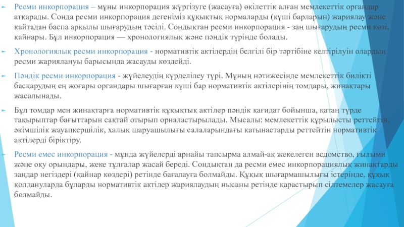 Слайд 9Инкорпорация - нормативтік материалдарды белгілі бір тәртіппен бірыңғай жинақтарға жиынтықтау
