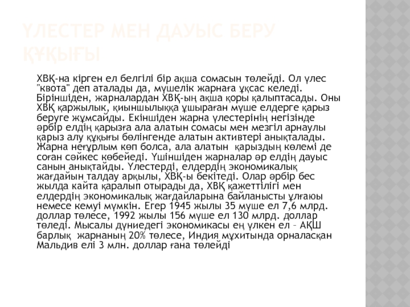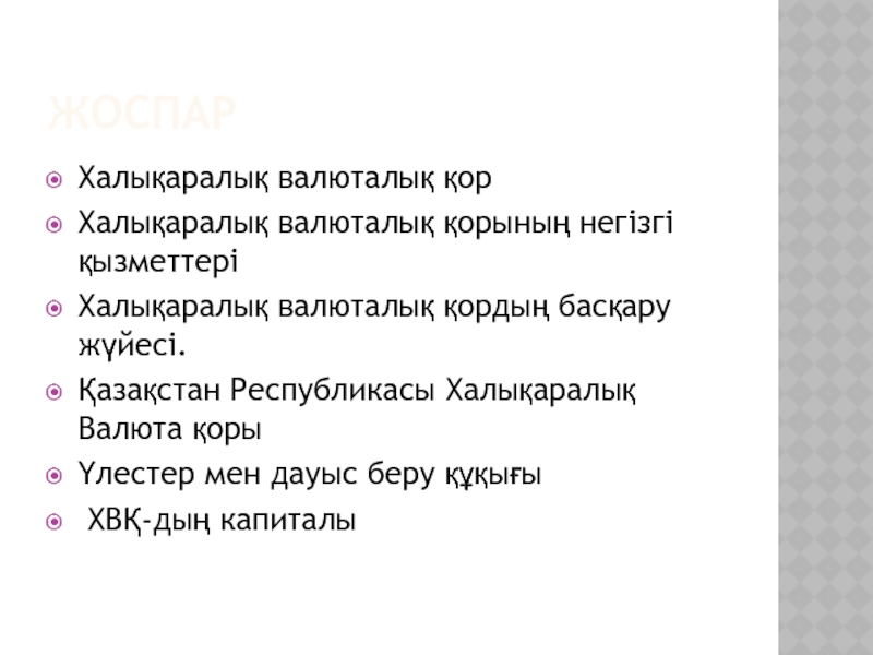 жоспарХалықаралық валюталық қор Халықаралық валюталық қорының негізгі қызметтеріХалықаралық валюталық қордың басқару жүйесі.Қазақстан Республикасы Халықаралық Валюта қорыҮлестер мен дауыс беру құқығы ХВҚ-дың капиталы
