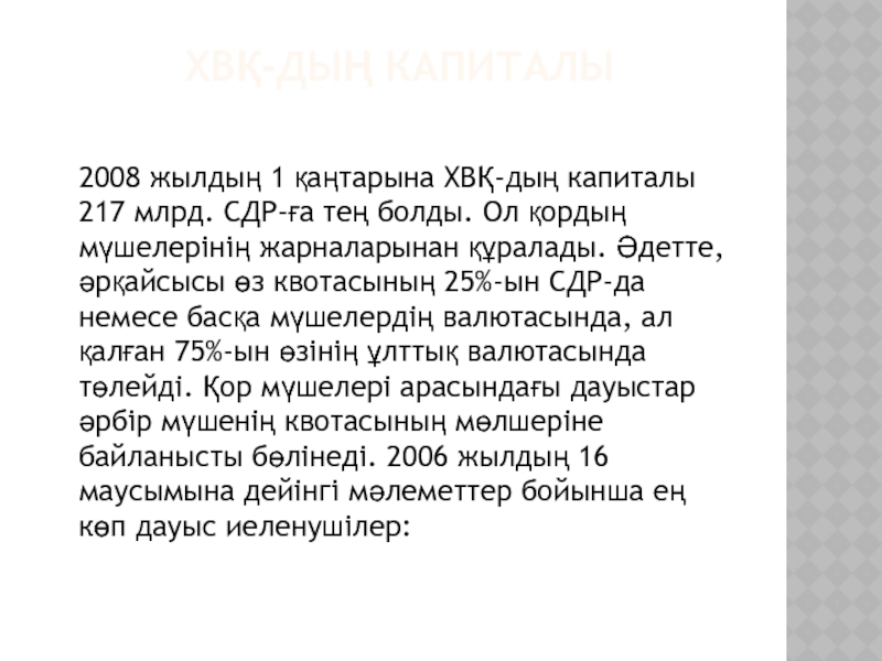ХВҚ-дың капиталы    2008 жылдың 1 қаңтарына ХВҚ-дың капиталы 217 млрд. СДР-ға тең болды. Ол қордың
