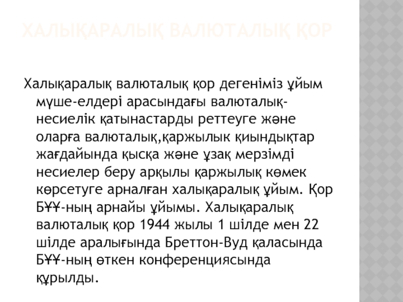 жоспарХалықаралық валюталық қор Халықаралық валюталық қорының негізгі қызметтеріХалықаралық валюталық қордың басқару жүйесі.Қазақстан Республикасы Халықаралық Валюта қорыҮлестер мен
