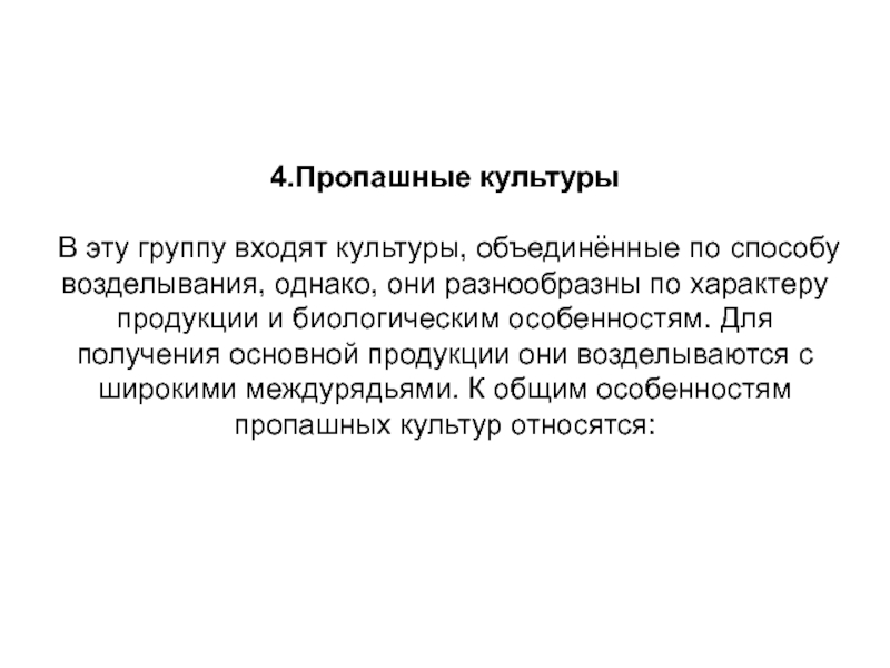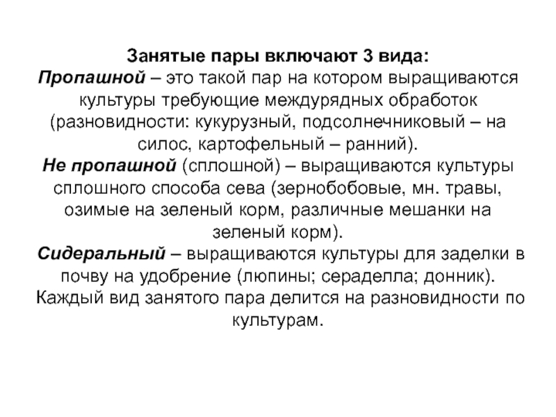 Не пропашной (сплошной) – выращиваются культуры сплошного способа сева (зернобобовые, мн. травы, озимые на зеленый корм, различные мешанки на зеленый корм).