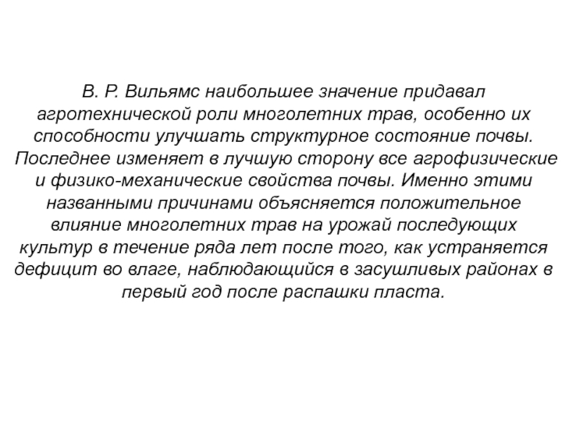 Слайд 20В. Р. Вильямс наибольшее значение придавал агротехнической роли многолетних трав,