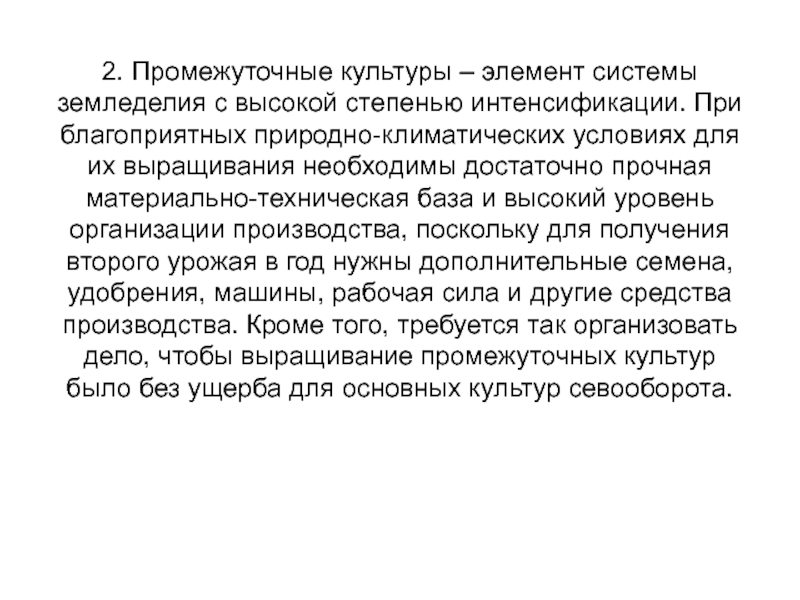 прочная материально-техническая база и высокий уровень организации производства, поскольку для получения второго урожая в год нужны дополнительные семена, удобрения, машины, рабочая сила и другие средства производства. Кроме того, требуется так организовать дело, чтобы выращивание промежуточных культур было без ущерба для основных культур севооборота.