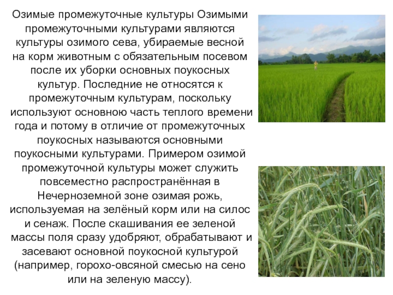 уборки основных поукосных культур. Последние не относятся к промежуточным культурам, поскольку используют основною часть теплого времени года и потому в отличие от промежуточных поукосных называются основными поукосными культурами. Примером озимой промежуточной культуры может служить повсеместно распространённая в Нечерноземной зоне озимая рожь, используемая на зелёный корм или на силос и сенаж. После скашивания ее зеленой массы поля сразу удобряют, обрабатывают и засевают основной поукосной культурой (например, горохо-овсяной смесью на сено или на зеленую массу).