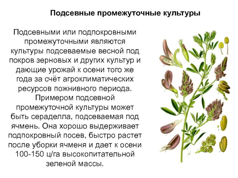 же года за счёт агроклиматических ресурсов пожнивного периода. Примером подсевной промежуточной культуры может быть сераделла, подсеваемая под ячмень. Она хорошо выдерживает подпокровный посев, быстро растет после уборки ячменя и дает к осени 100-150 ц/га высокопитательной зеленой массы.