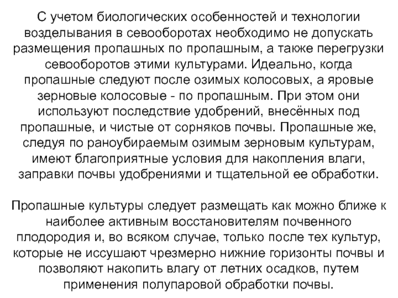 Пропашные культуры следует размещать как можно ближе к наиболее активным восстановителям почвенного плодородия и, во всяком случае, только после тех культур, которые не иссушают чрезмерно нижние горизонты почвы и позволяют накопить влагу от летних осадков, путем применения полупаровой обработки почвы.