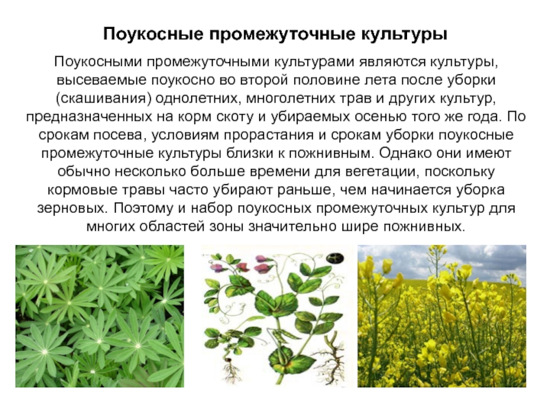 предназначенных на корм скоту и убираемых осенью того же года. По срокам посева, условиям прорастания и срокам уборки поукосные промежуточные культуры близки к пожнивным. Однако они имеют обычно несколько больше времени для вегетации, поскольку кормовые травы часто убирают раньше, чем начинается уборка зерновых. Поэтому и набор поукосных промежуточных культур для многих областей зоны значительно шире пожнивных.