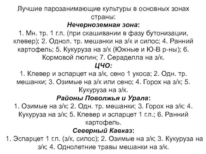 Слайд 13Лучшие парозанимающие культуры в основных зонах страны: