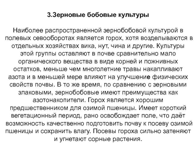 другие. Культуры этой группы оставляют в почве сравнительно мало органического вещества в виде корней и пожнивных остатков, меньше чем многолетние травы накапливают азота и в меньшей мере влияют на улучшение физических свойств почвы. В то же время, по сравнению с зерновыми злаковыми, зернобобовые имеют преимущества как азотонакопители. Горох является хорошим предшественником для озимой пшеницы. Имеет короткий вегетационный период, рано освобождает поле, что даёт возможность качественно подготовить почву к посеву озимой пшеницы и сохранить влагу. Посевы гороха сильно затеняют и угнетают сорные растения.