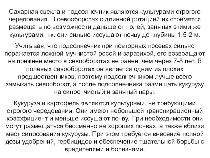 Слайд 29Сахарная свекла и подсолнечник являются культурами строгого чередования. В севооборотах