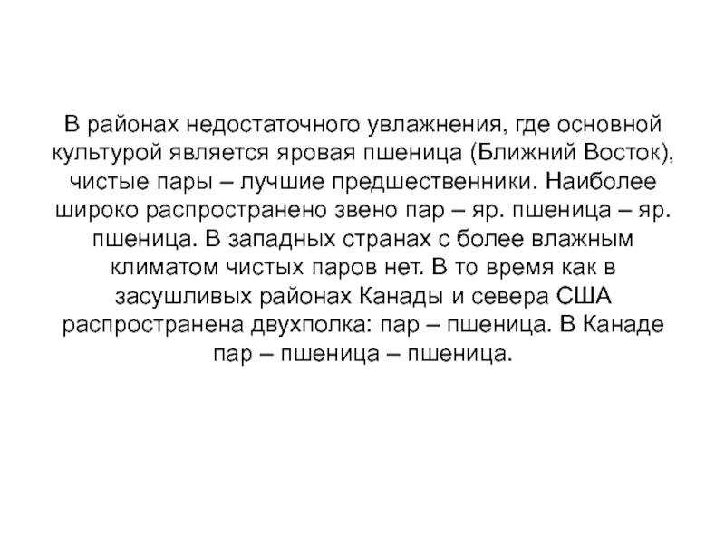звено пар – яр. пшеница – яр. пшеница. В западных странах с более влажным климатом чистых паров нет. В то время как в засушливых районах Канады и севера США распространена двухполка: пар – пшеница. В Канаде пар – пшеница – пшеница.