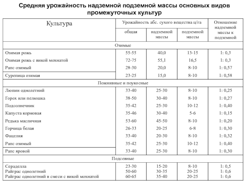 Слайд 44Средняя урожайность надземной подземной массы основных видов промежуточных культур